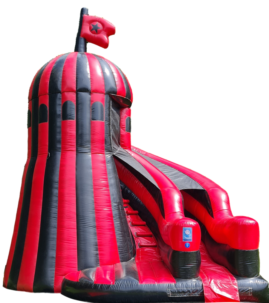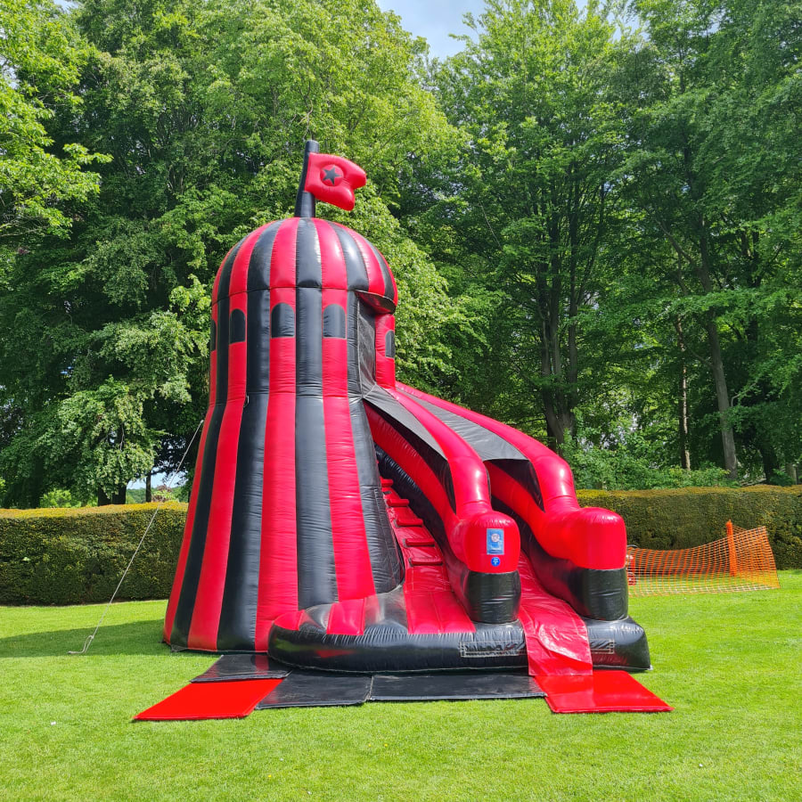 Elevate your event experience with the show-stopping 24ft Helter Skelter Slide! 🎡 Standing tall at an impressive 7 meters, this black and red striped inflatable promises to captivate attention and deliver endless fun. From town fairs to corporate functions, this classic attraction brings the fairground magic directly to your location.
